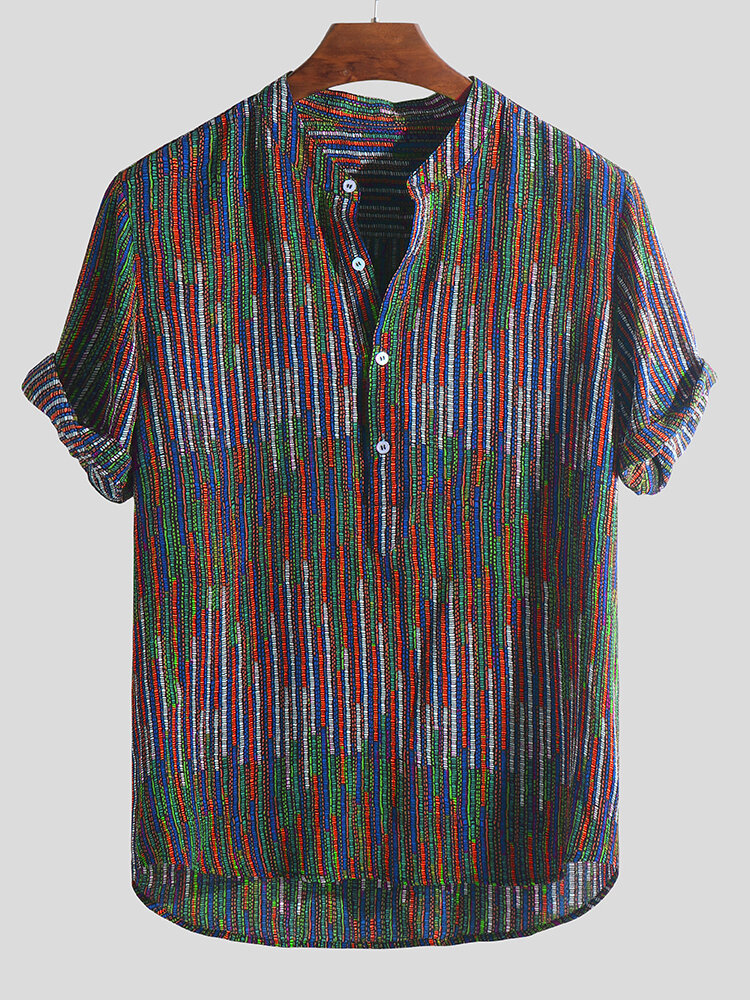 Mens Ethnic Style Printed Colorful Stripe Loose T-shirts Stand Collar Henley Shirts – 3XL Yellow