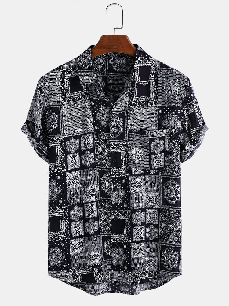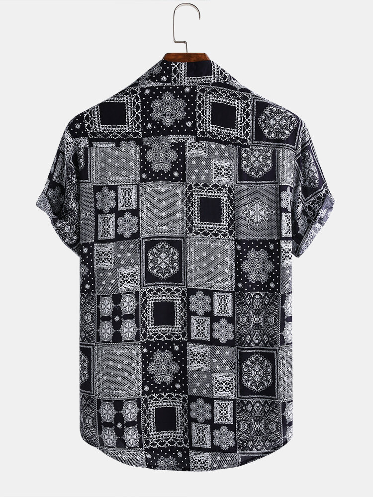 Mens Ethnic Style Printing Plaid Breathable Turn Down Collar Casual Shirts – Grey 2XL