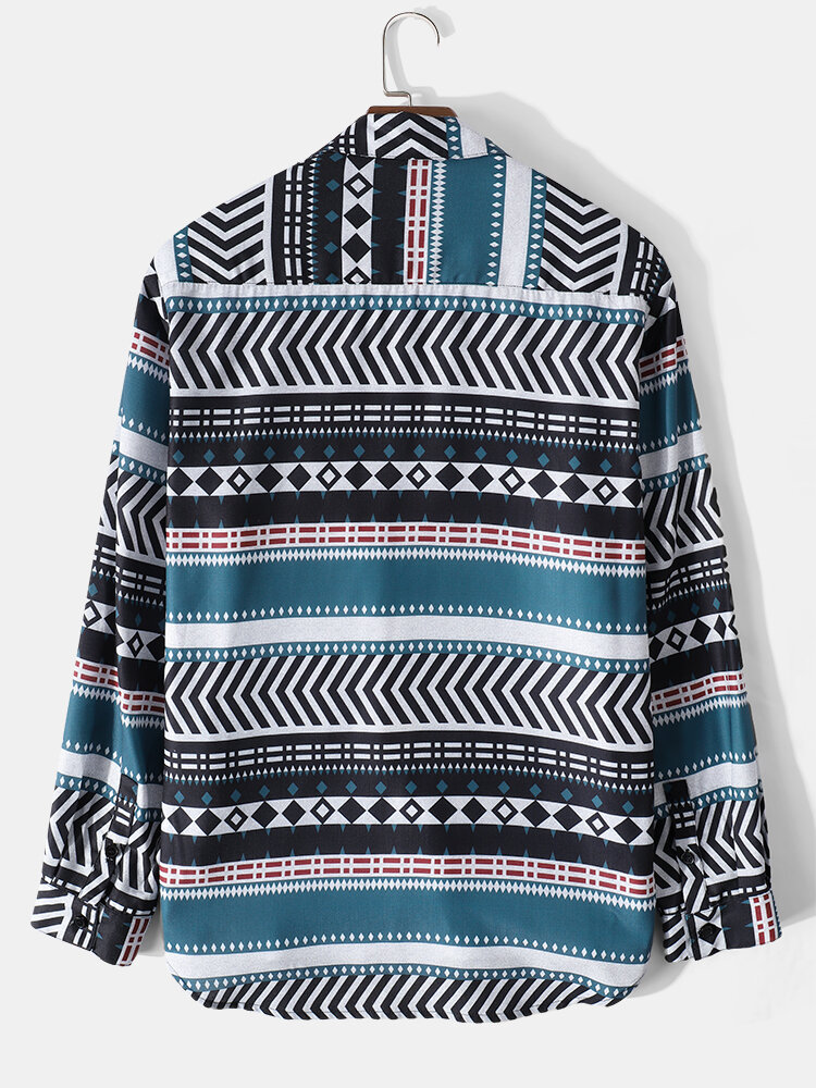Mens Ethnic Style Tribal Pattern Print Lapel Long Sleeve Shirt With Pocket – Black S