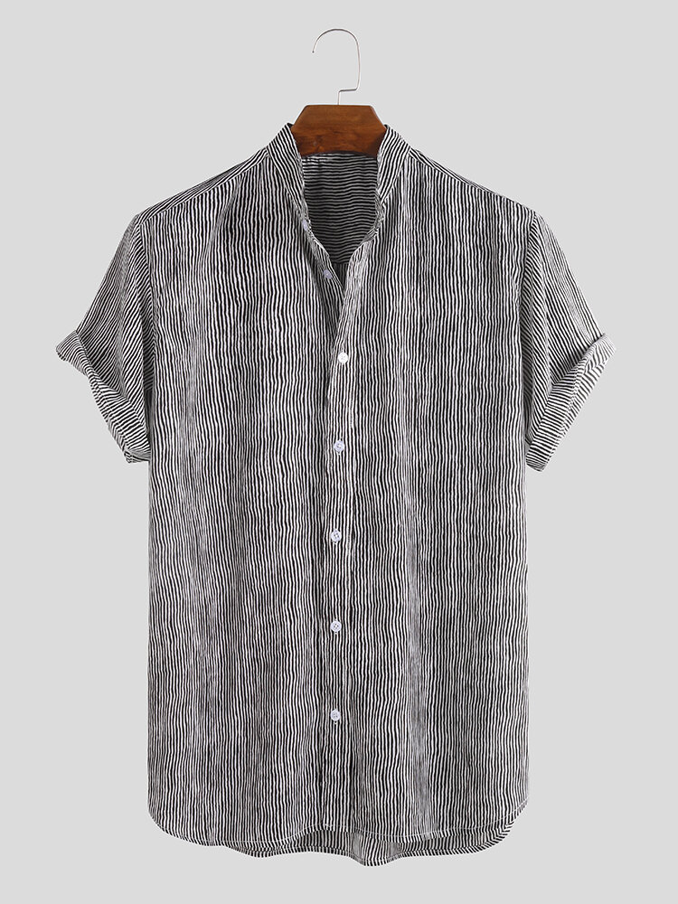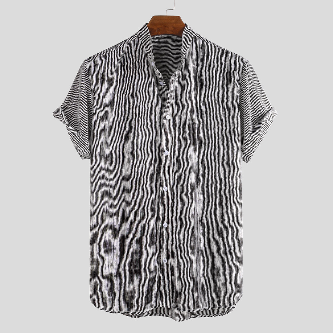 Item Type: Shirts Pattern Type: StripeGender: Men Fit Type: FitStyle: Fashion, Casual, Ethnic Style Thickness: RegularCollar: Turn-down Collar Season: Spring, SummerMaterial: Polyester,SpandexColor: Blue, Black, GrayCuff Type: Shirt Sleeves Occasion: LeisureSleeve Length: Short Sleeve Package includes