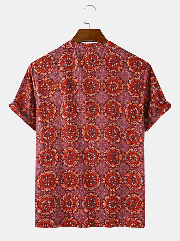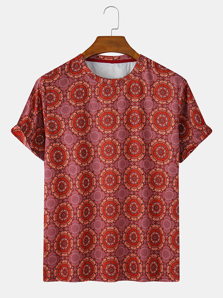 Mens Ethnic Totem Print Round Neck Casual Short Sleeve T-Shirts – Red M