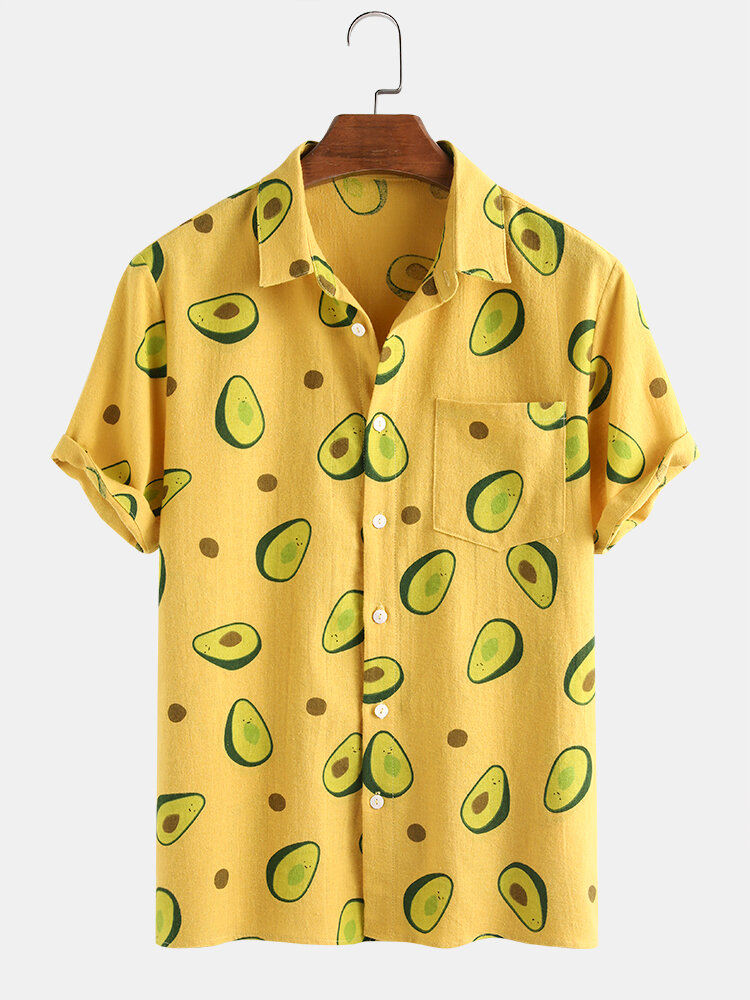 Mens Fashion Avocado Printing Breathable Short Sleeve Casual Shirts – Yellow 3XL