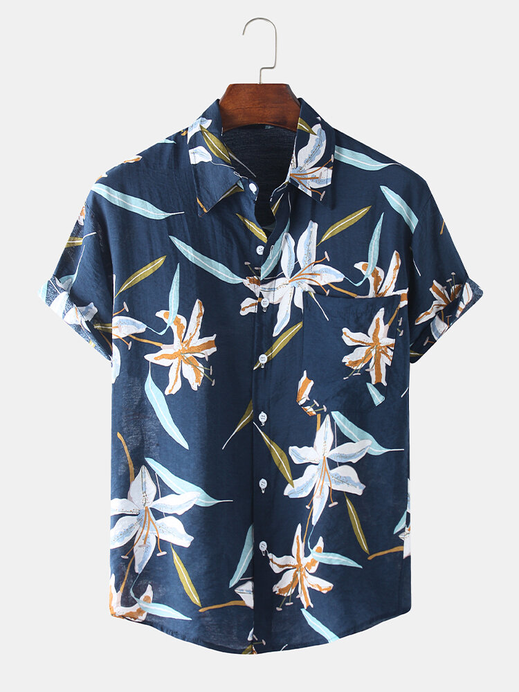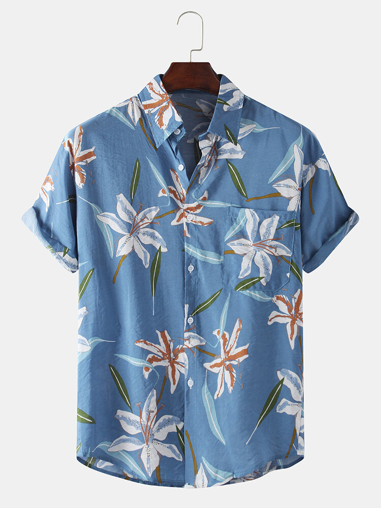 Mens Fashion Big Floral Printing Turn Down Collar Casual Shirts – Black S