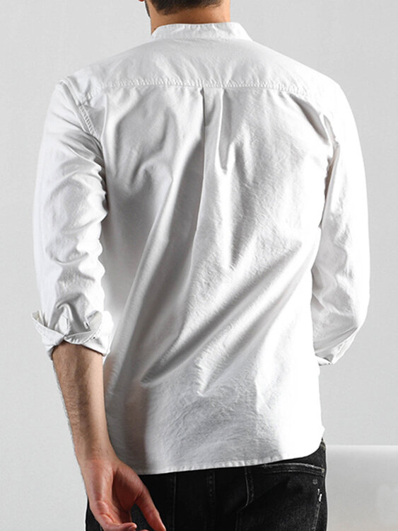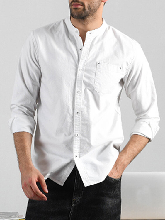 Mens Fashion Brief Long Sleeve Stand Collar Solid Color Casual Shirts – White 3XL