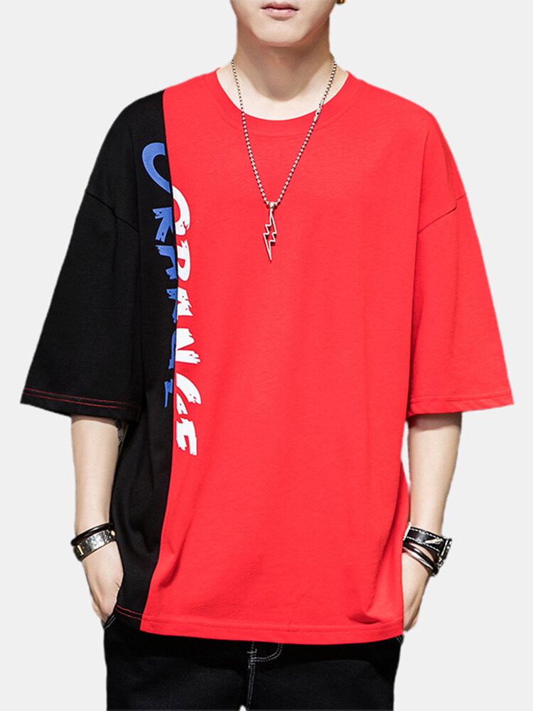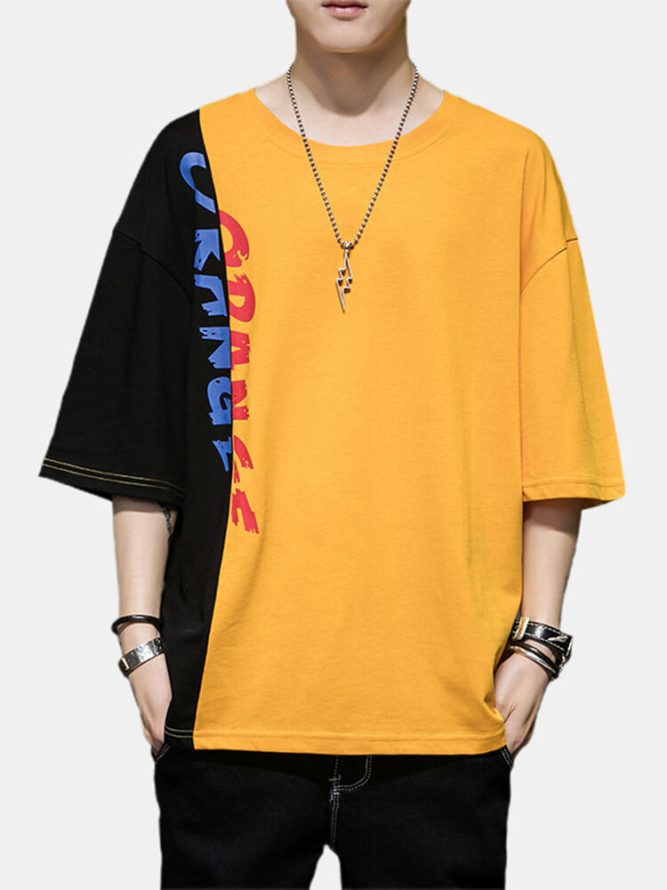 Description:Item Type: T-ShirtsPattern Type: PatchworkGender: MenFit Type: FitStyle: Casual,FashionThickness: RegularCollar: Crew NeckSeason: SummerDecorations: LettersMaterial: 100% CottonSleeve Length: Short SleeveColor: Yellow,Black,RedCuff Type: Shirt SleeveOccasion: Leisure,Home,Daylife