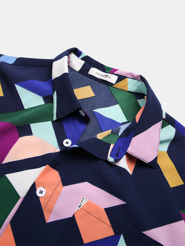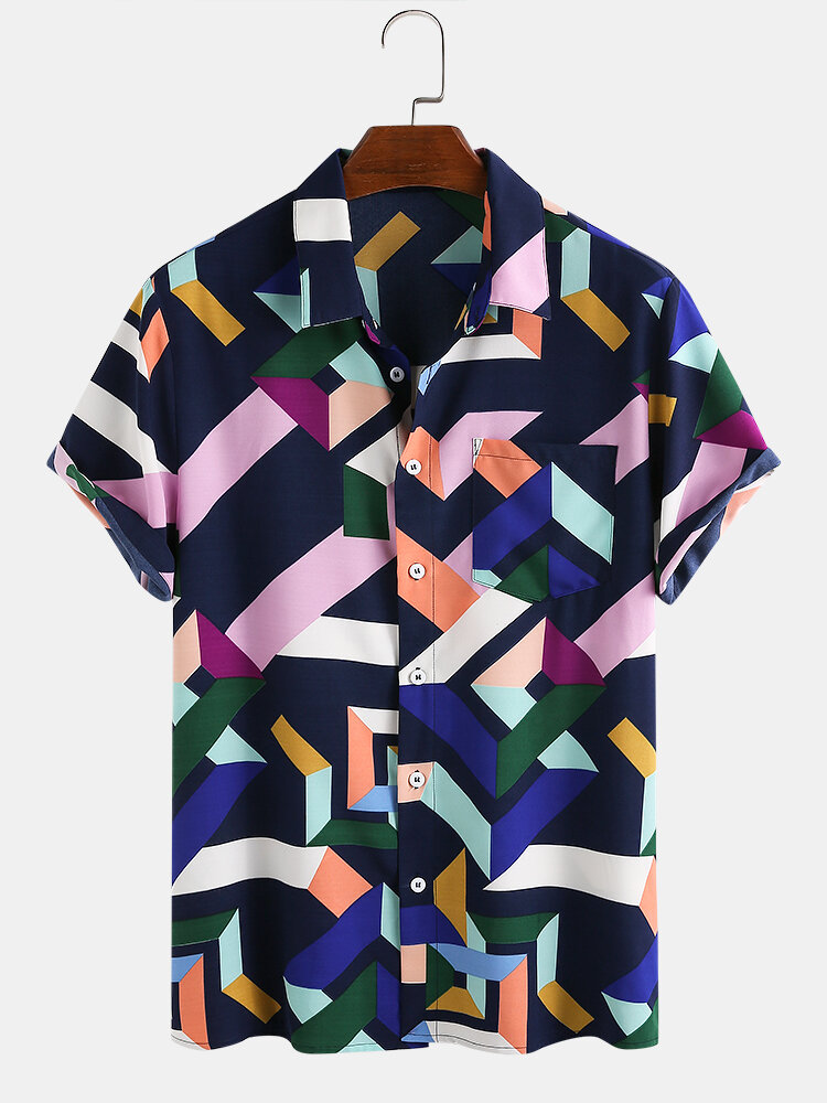 Mens Fashion Color Block Geometric Printing Breathable Short Sleeve Casual Shirts – Blue 2XL