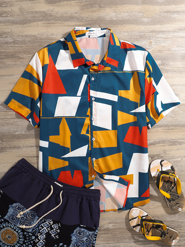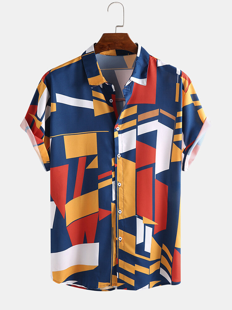 Brand Name: ChArmkpRSleeve Length: Short SleeveItem Type: ShirtsPattern Type: ColorfulGender: MenFit Type: LooseStyle: Leisure, FashionThickness: RegularCollar: Turn-down CollarSeason: SummerMaterial: PolyesterColor: Colorful, Contrast ColorCuff Type: Straight SleevesOccasion: Casual