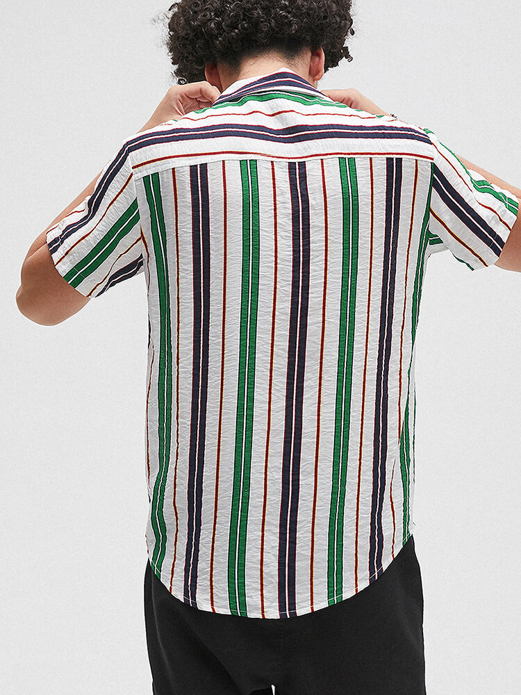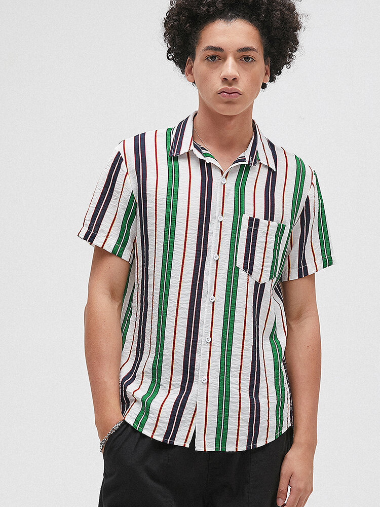 Description:Item Type: ShirtsPattern Type: StripeGender: MenFit Type: FitStyle: Casual,FashionThickness: RegularCollar: Turn Down CollarSeason: SummerDecorations: PocketMaterial: 80% Viscose,20% PolyesterSleeve Length: Short SleeveColor: GreenCuff Type: Shirt SleeveOccasion: Leisure,Home,Daylife