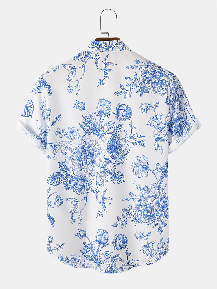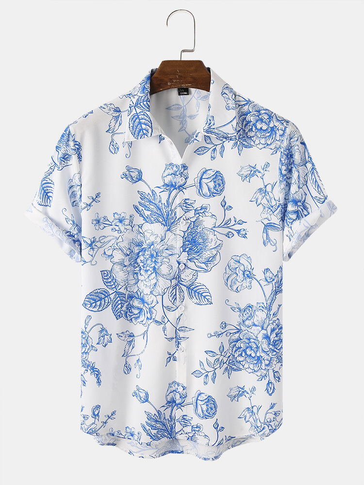 Mens Fashion Floral Print Chinese Style Short Sleeve Shirts – Blue M