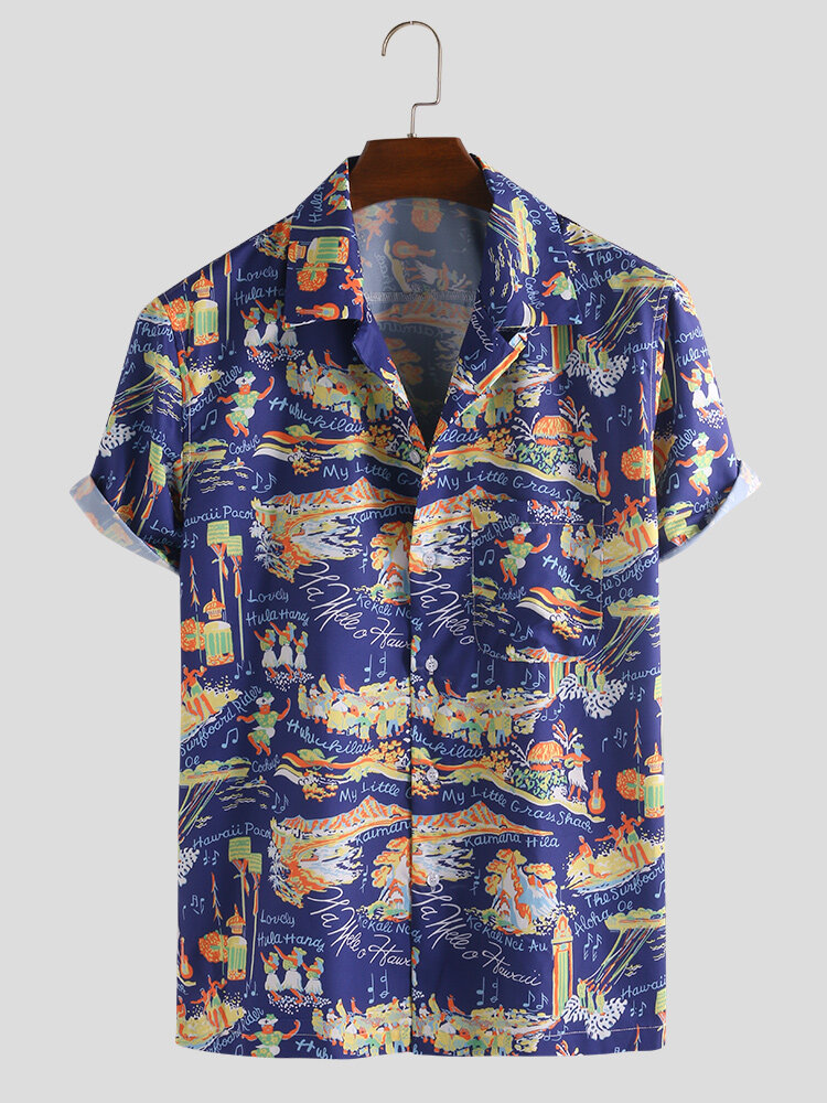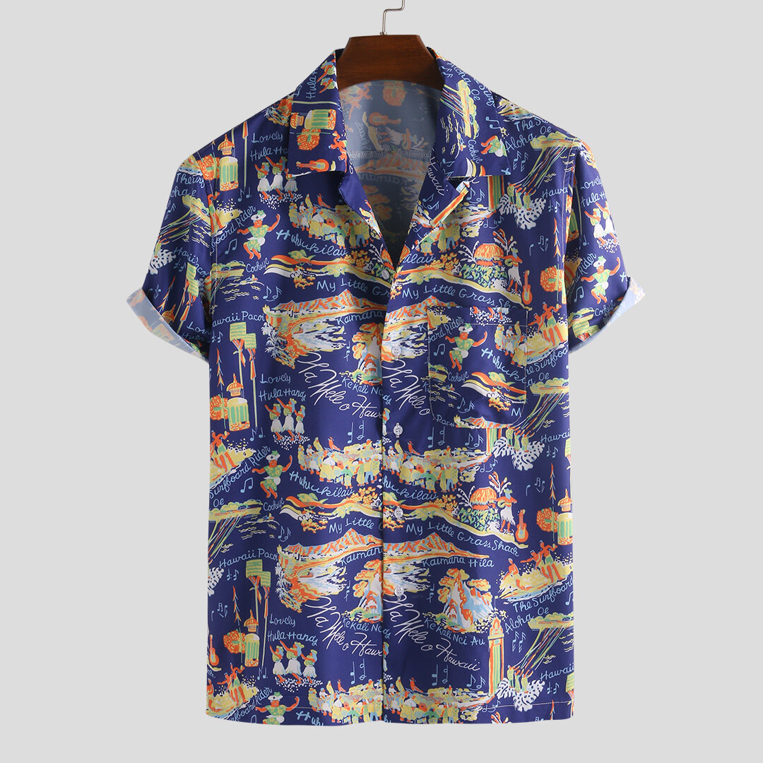 Mens Fashion Funny Printed Hawaiian Short Sleeve Casual Shirts – L Navy