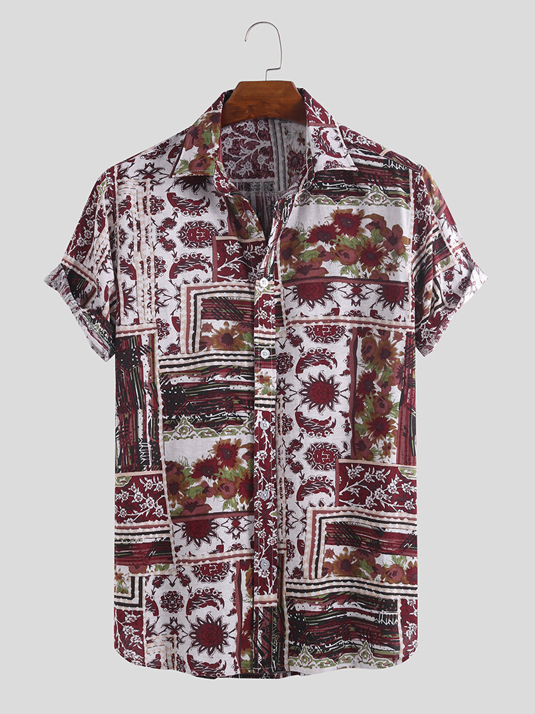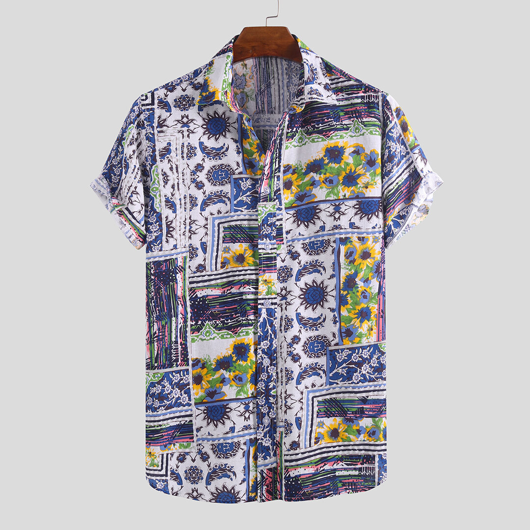 Item Type: Shirts Pattern Type: PrintingGender: Men Fit Type: FitStyle: Casual, Fashion, Ethnic Style Thickness: RegularCollar: Turn-down Collar Season: Spring, SummerMaterial:85% Cotton 15% Flax Sleeve Length: Short SleeveColor: Blue RedCuff Type: Shirt Sleeves Occasion: Leisure Package includes