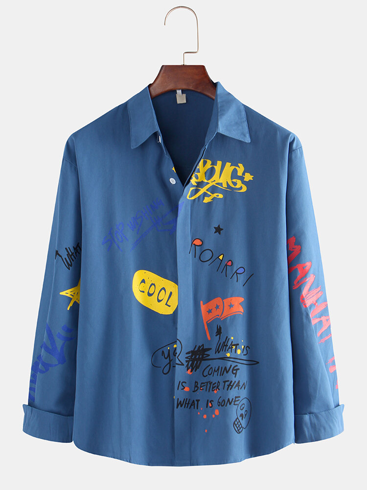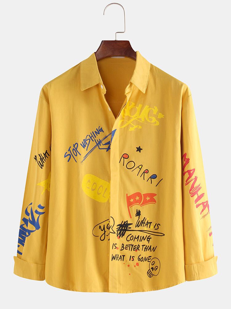 Mens Fashion Graffiti Printing Long Sleeve Turn Down Collar Casual Shirts – L Yellow