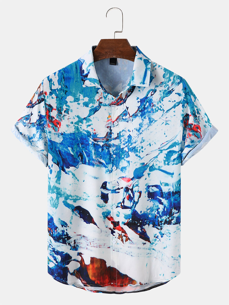 Mens Fashion Landscape Print Short Sleeve Casual Shirts – Blue M