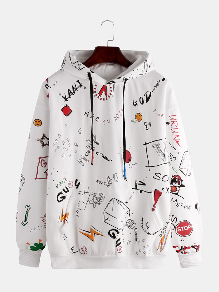 Mens Fashion Multi Pattern Overhead Printing Hooded Casual Sweatshirt – 2XL Black