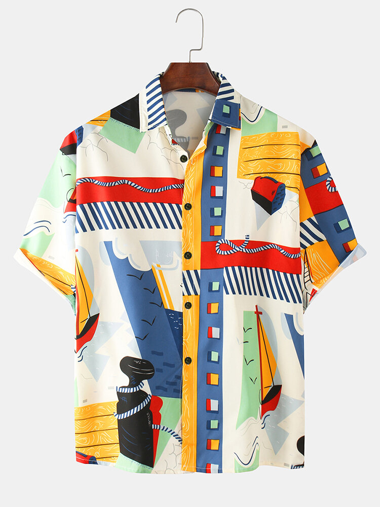 Description:Item Type: ShirtsPattern Type: PrintingGender: MenFit Type: FitStyle: Casual,FashionThickness: RegularCollar: Turn Down CollarSeason: SummerDecorations: PatternMaterial: 100% PolyesterSleeve Length: Short SleeveColor: #1,#2Cuff Type: Shirt SleeveOccasion: Leisure,Home,Daylife