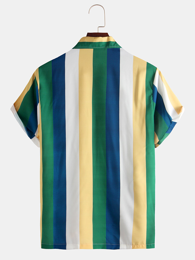 Item Type: ShirtsPattern Type: StripeGender: Men Fit Type: FitStyle: Casual,Fashion Thickness: RegularCollar: Turn Down CollarSeason: SummerDecorations: Multi Colors StripeMaterial: 100% PolyesterSleeve Length: Short SleeveColor: BlackCuff Type: Shirt Sleeve Occasion: Leisure,Home,Daylife Package includes