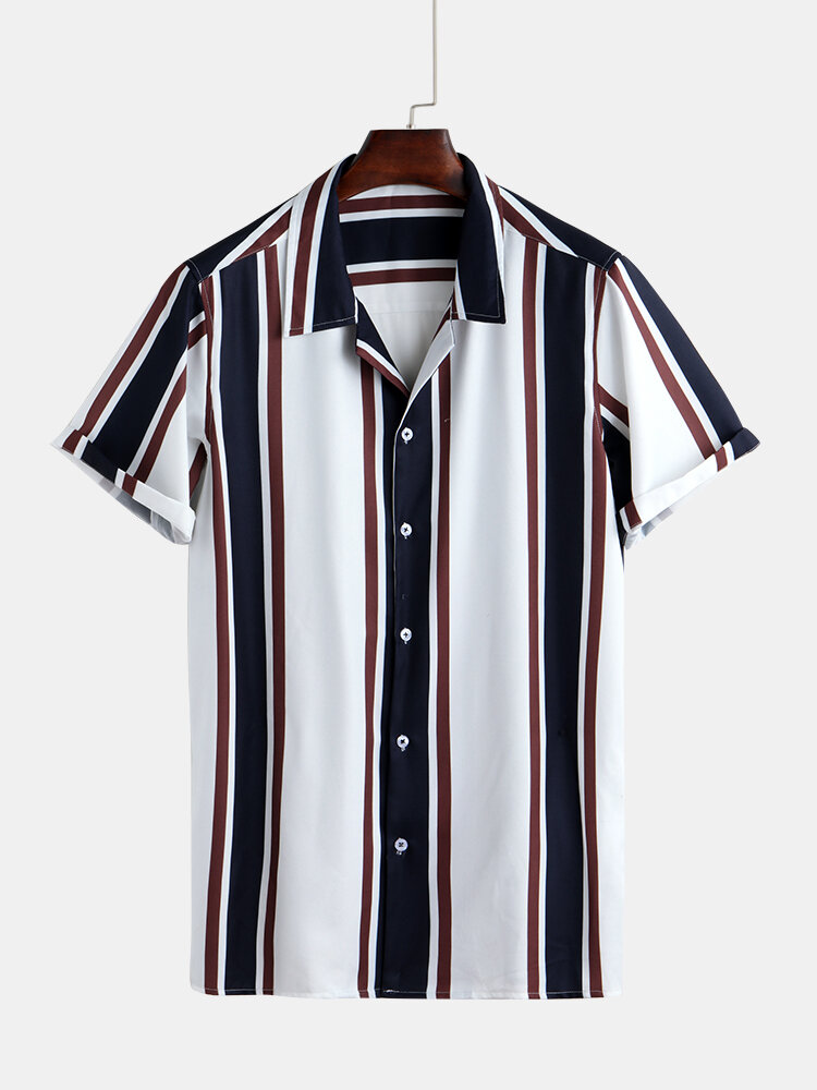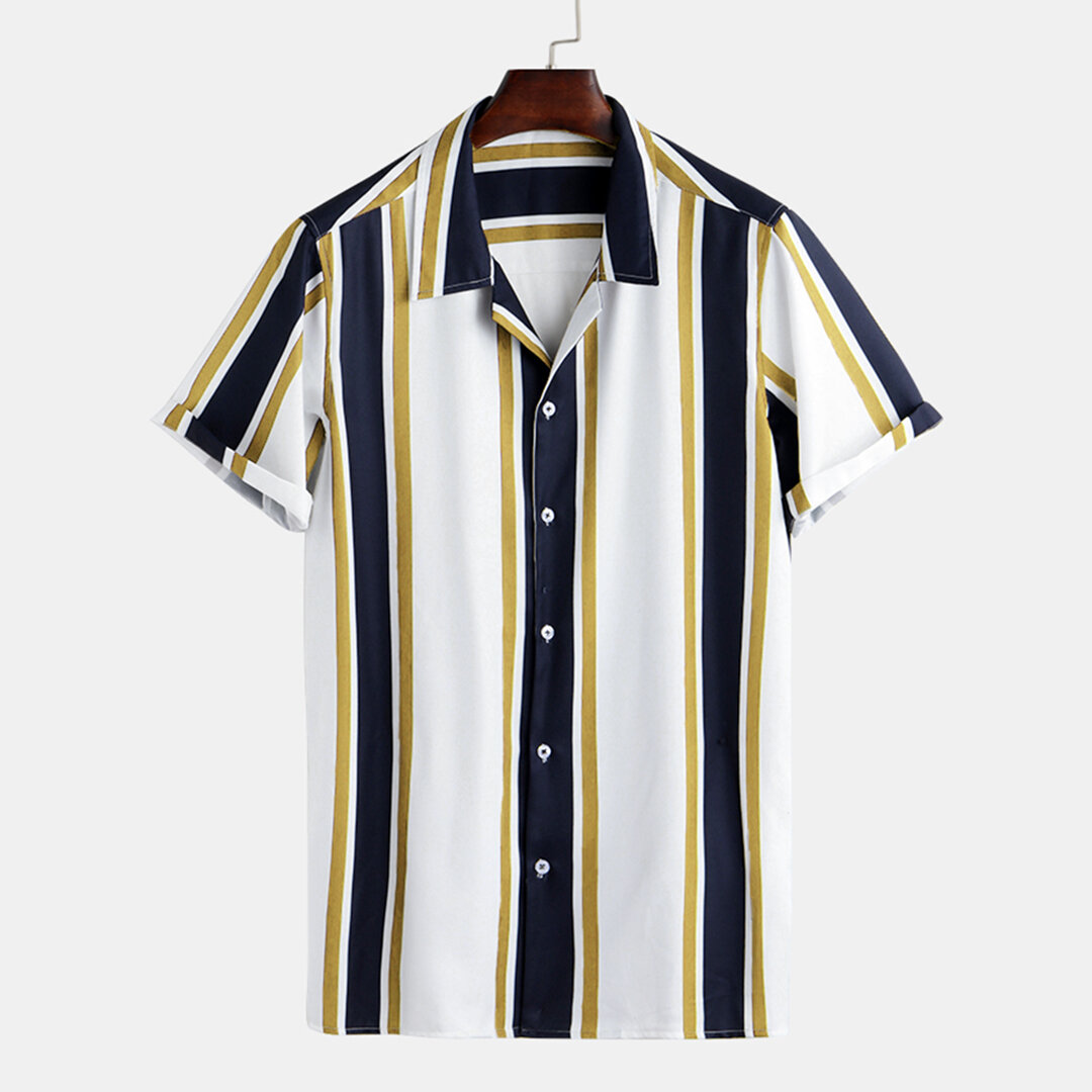 Item Type: Shirts Pattern Type: StripeGender: Men Fit Type: FitStyle: Casual, Fashion Thickness: RegularCollar: Turn Down CollarSeason: Spring, Summer, AutumnMaterial: PolyesterColor: Blue Red, Blue,YellowCuff Type: Shirt Sleeves Occasion: LeisureSleeve Length: Short Sleeve Package includes