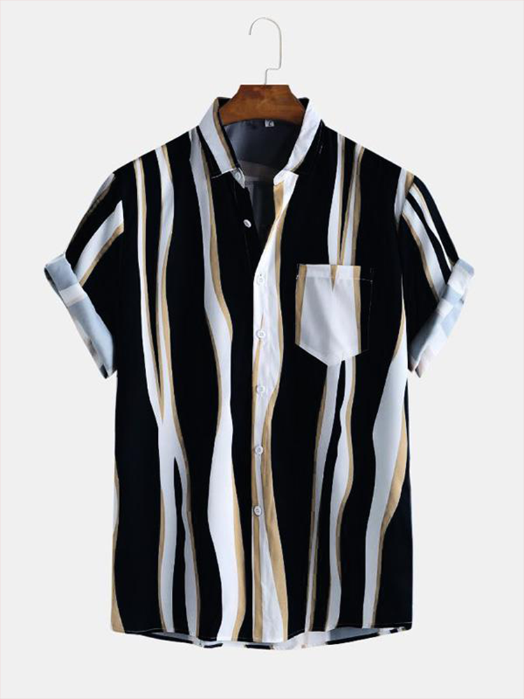 Description:Decoration:PocketFit Type:Regular FitMaterial:PolyesterNeckline:LapelPattern Type:StripedScene:Leisure,Home,CasualSeason:Spring,SummerSize:L,S,XL,MSleeve:Short SleeveStyle:CasualThickness:Regular