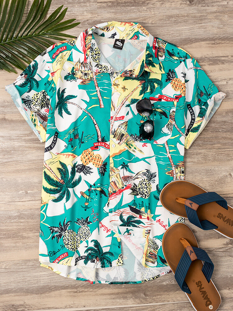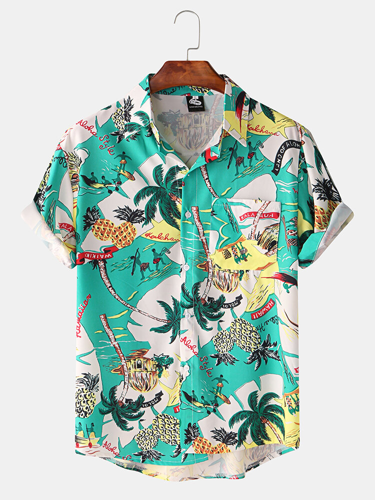 Mens Fashion Tropical Style Printing Breathable Short Sleeve Casual Shirts – White M