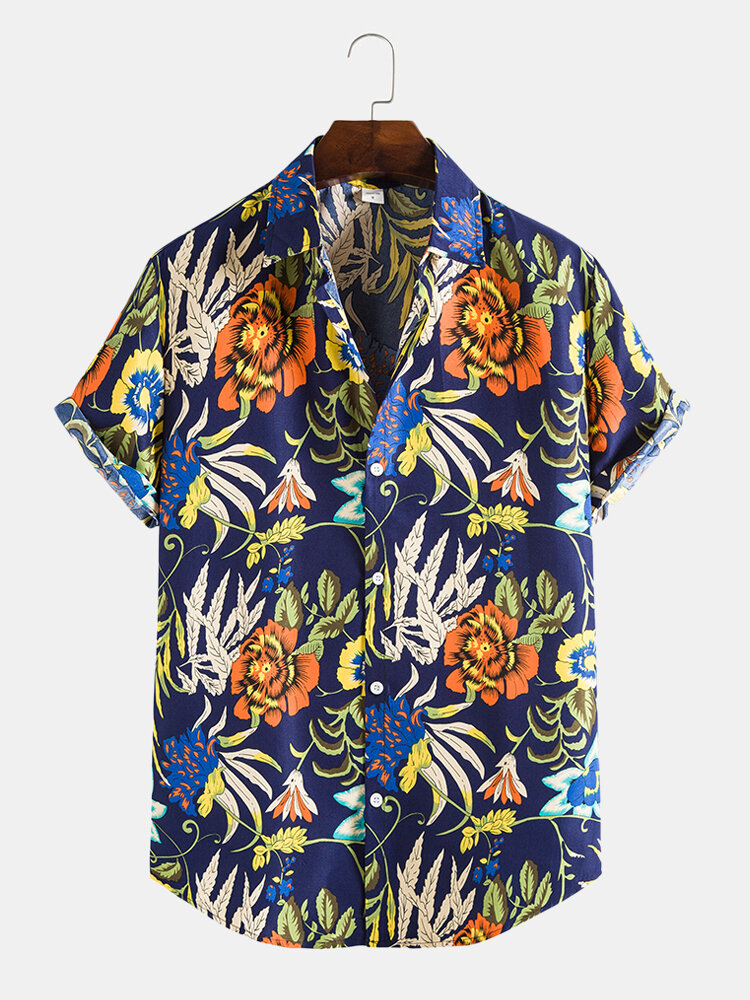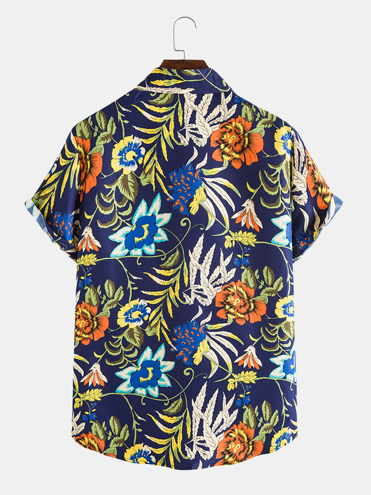 Mens Floral Graphics Holiday Short Sleeve Curved Hem Shirt – Navy L