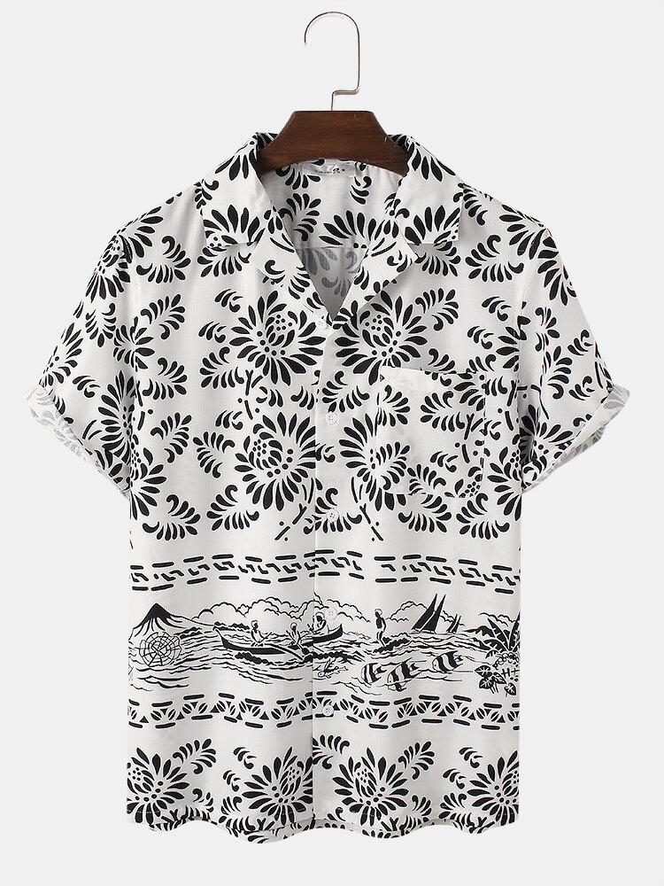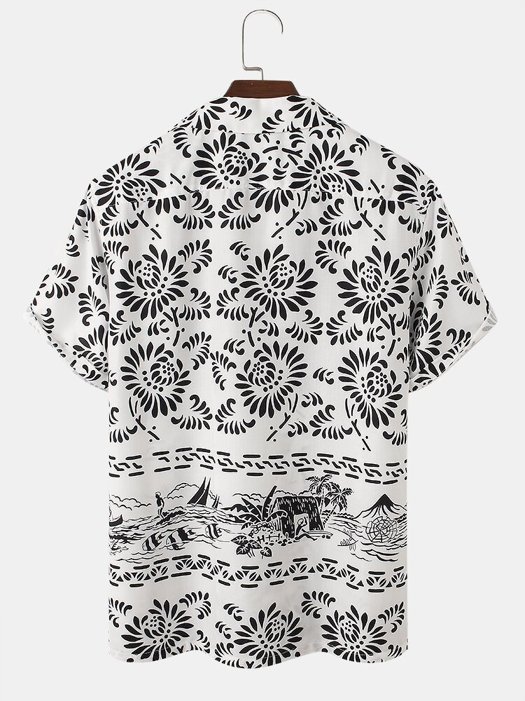 Mens Floral Landscape Print Lapel Designer Short Sleeve Shirts – Off White S