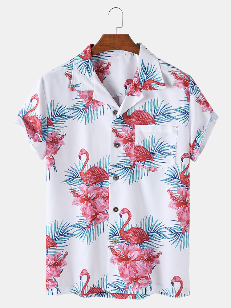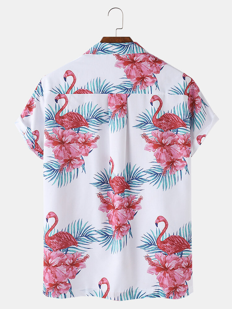Mens Floral Print Flamingo Pattern Revere Collar Short Sleeve Casual Shirts – White S