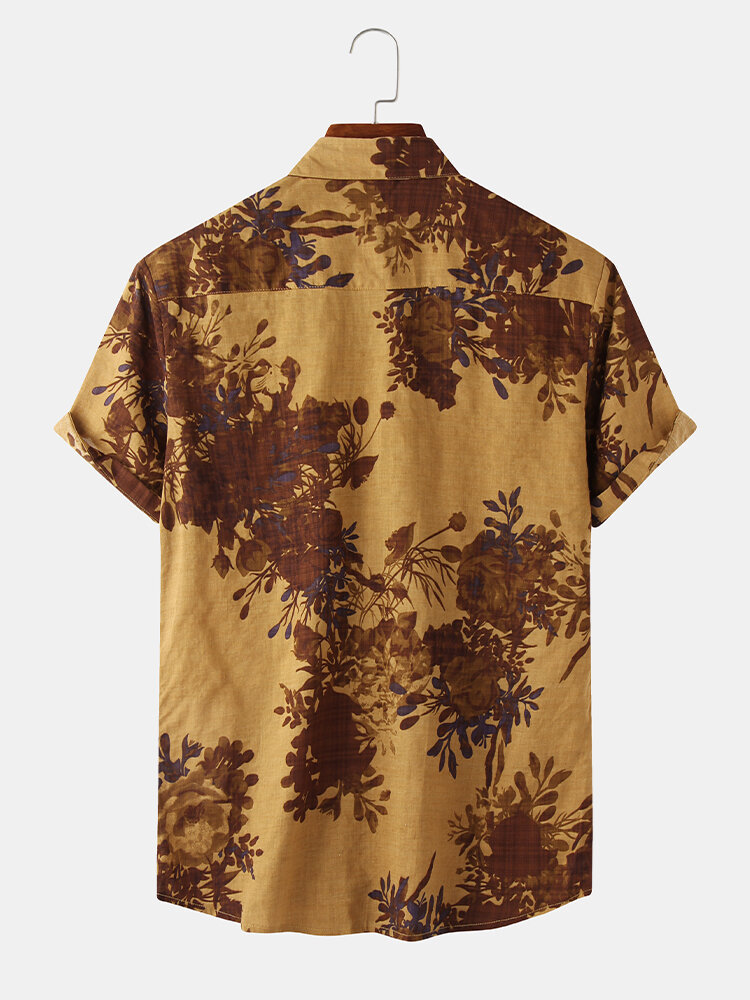 Mens Floral Print Vintage Holiday Casual Button Up Lapel Short Sleeve Shirt – Yellow S