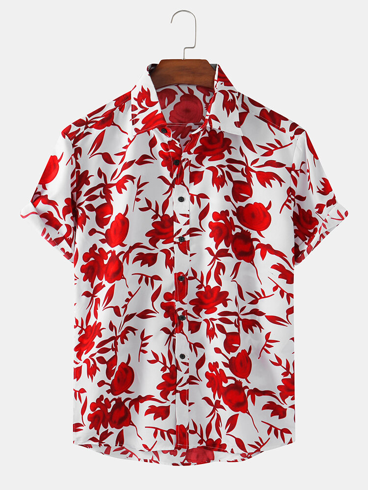 Mens Floral Printed Breathable Casual Short Sleeve Shirts – White M