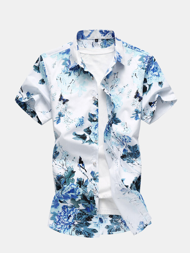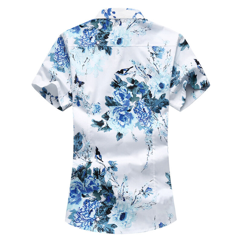 Mens floral shirt Hawaii style holiday casual short-sleeved shirts – L White