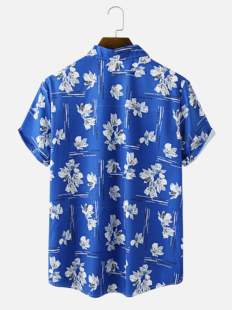 Mens Flower Print Revere Collar Short Sleeve Shirt – Blue S
