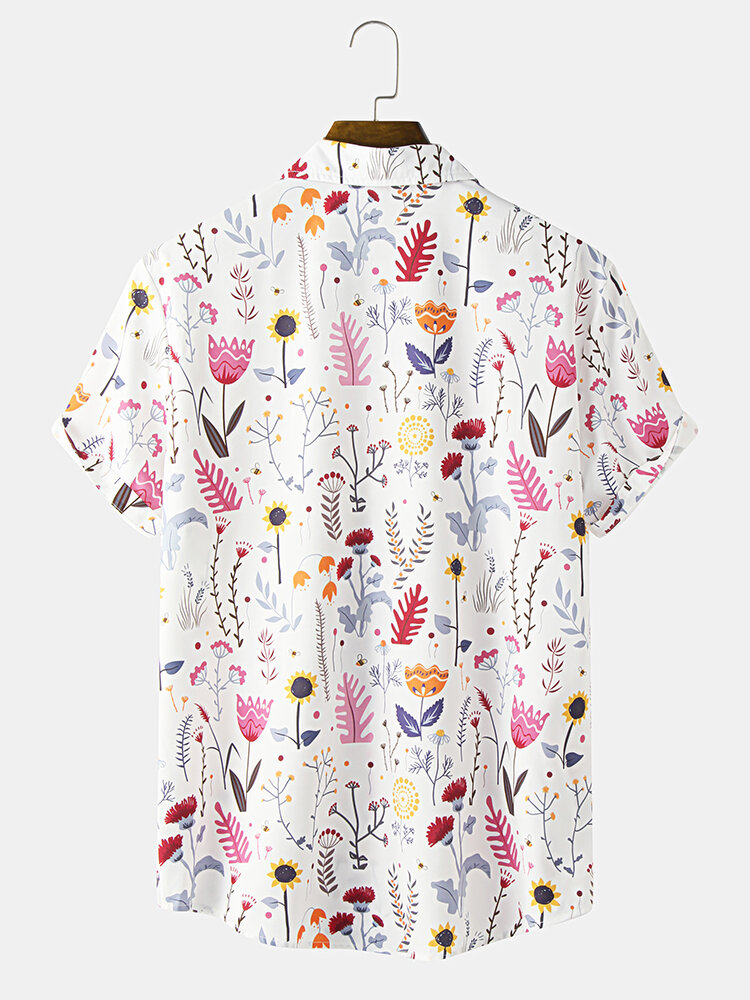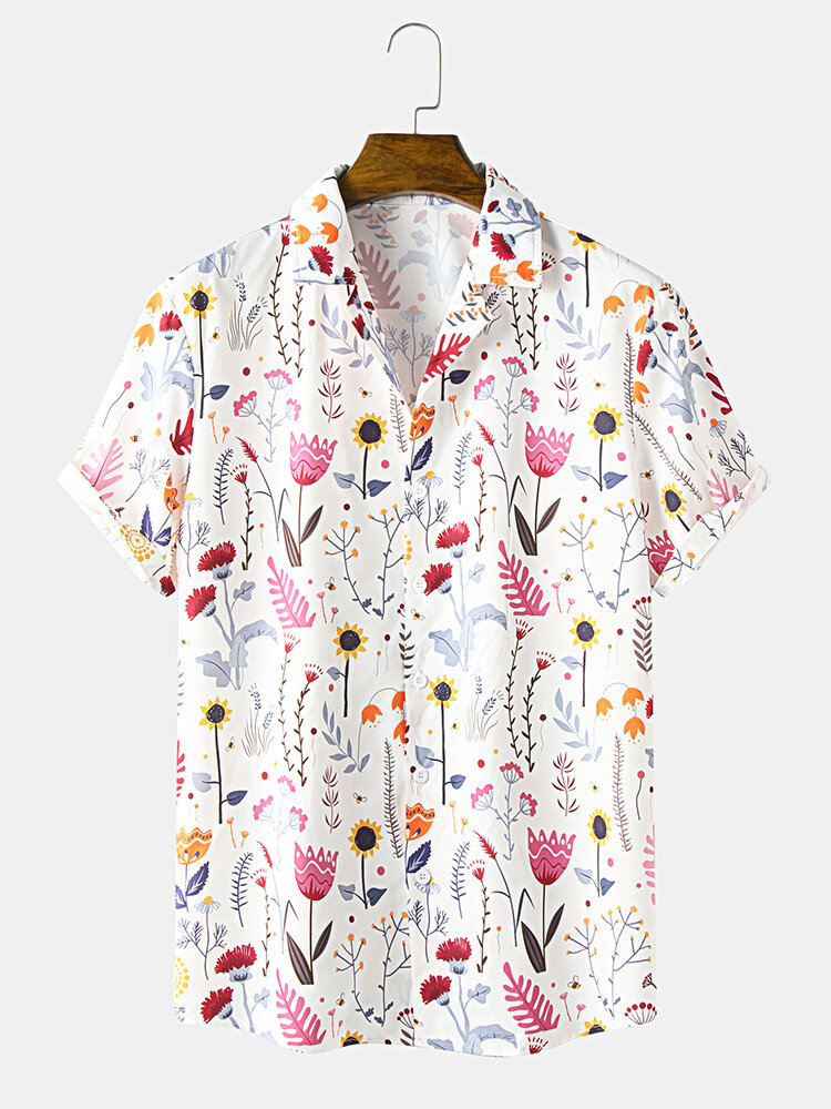 Mens Flower Print Revere Collar Short Sleeve Shirt – White XL