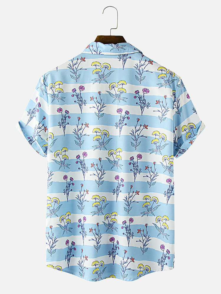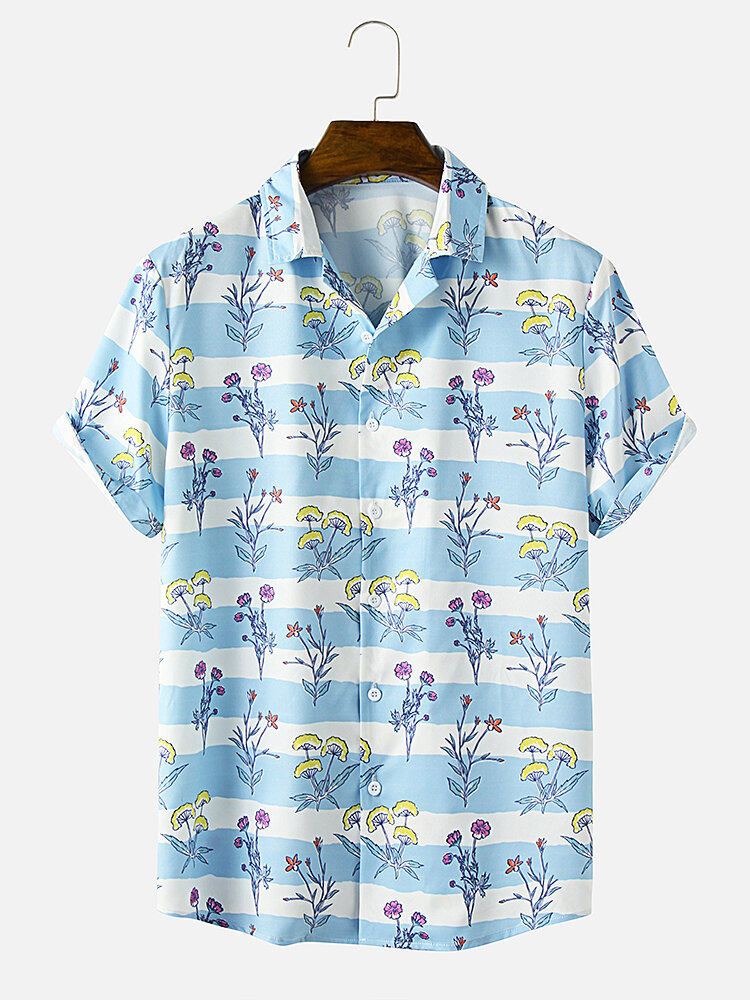 Mens Flower Print Stripe Lapel Short Sleeve Shirt – Blue S
