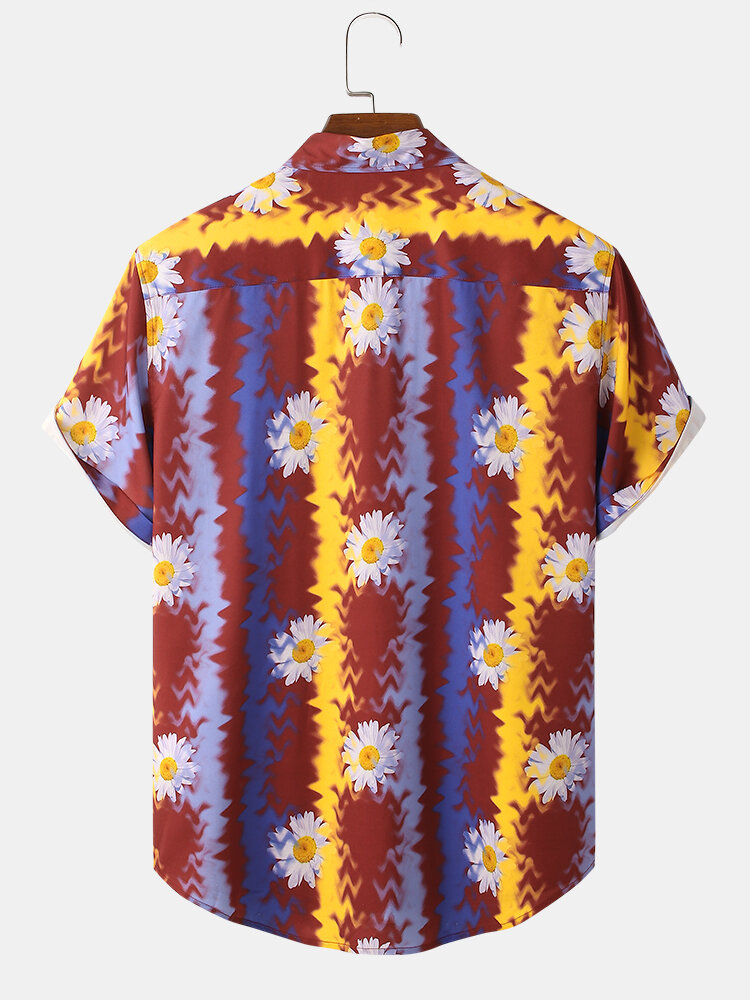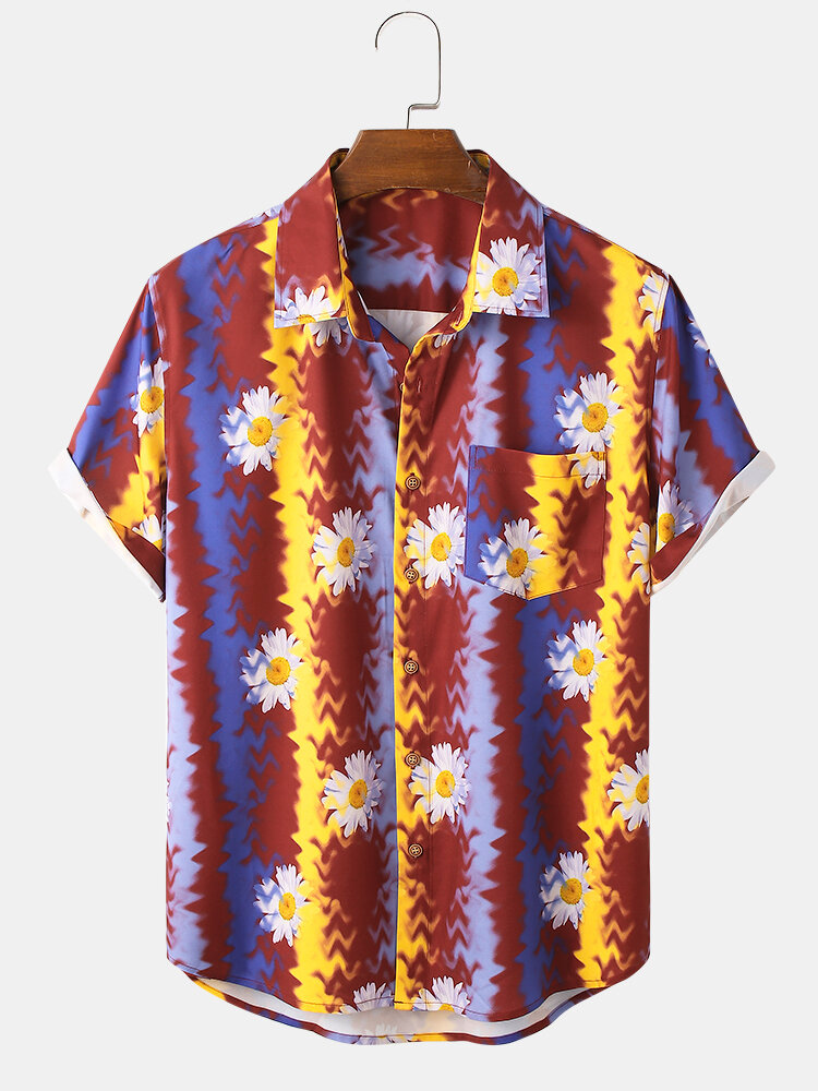 Mens Flower Print Wave Pattern Lapel Short Sleeve Shirt – Red S