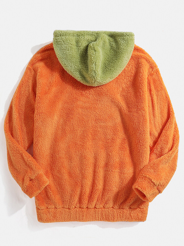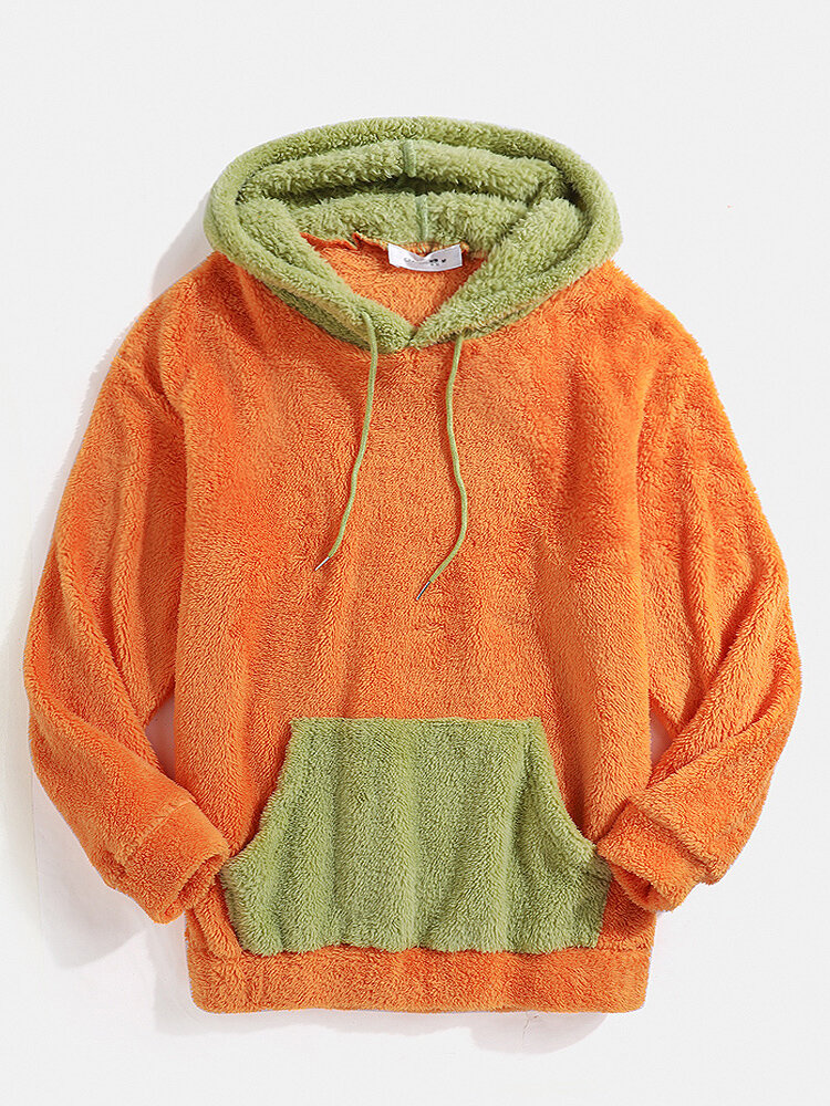 Mens Fluffy Patchwork Cozy Drawstring Hoodie With Pocket – Orange S