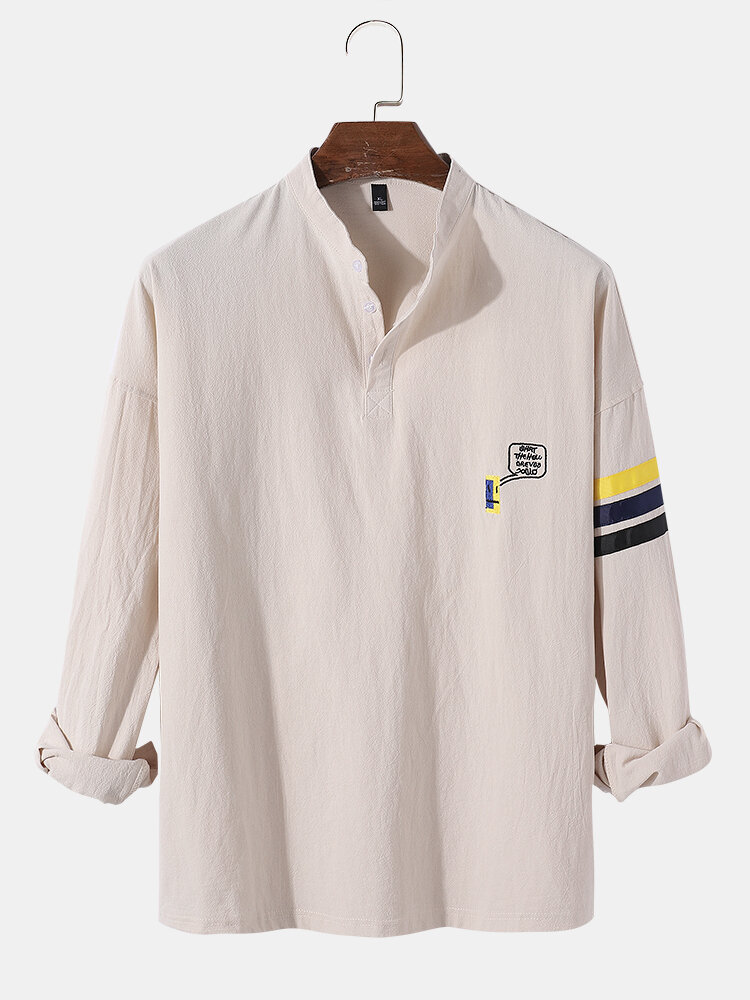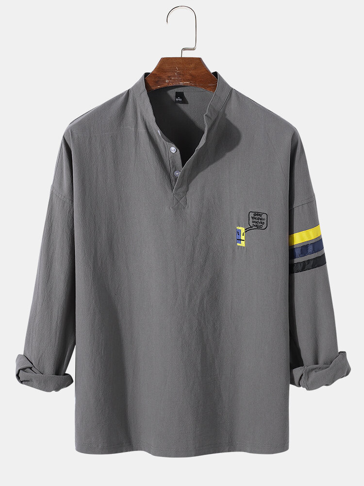 Mens Fnuuy Pattern & Slogant Embroidery Side Stripe Preppy Henley Shirt – Black XL