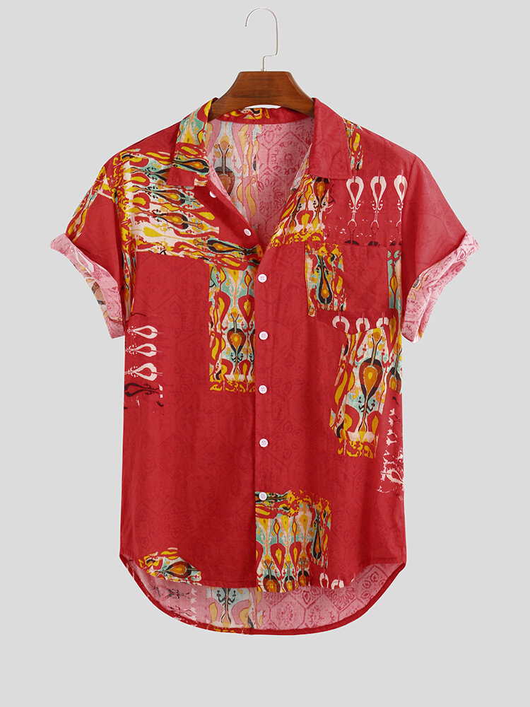 Mens Folk Symbol Pattern Summer Casual Loose Printing Shirts – M Green