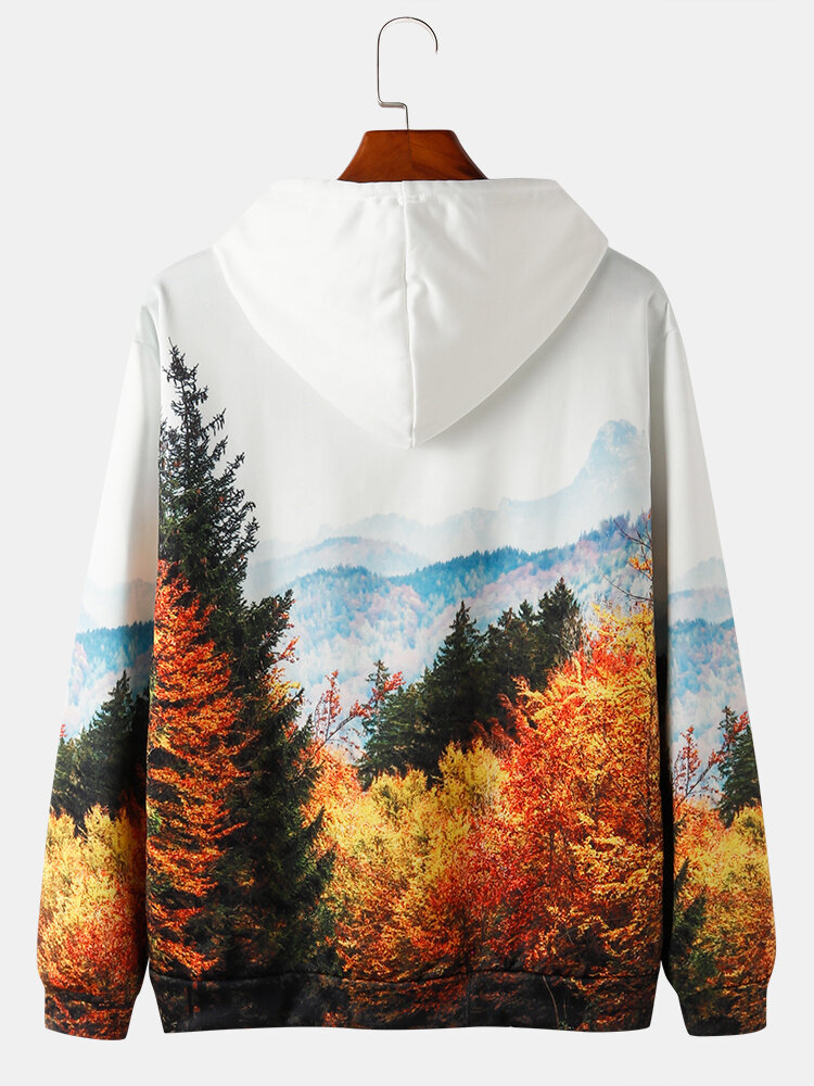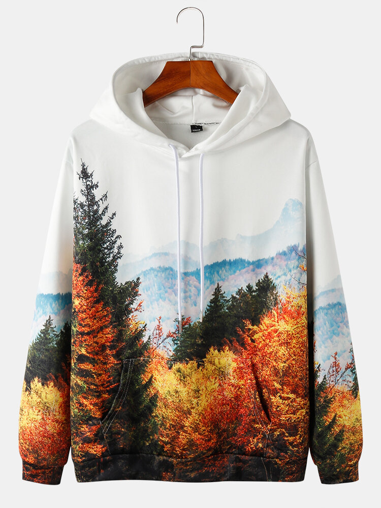 Mens Forest Landscape Print Drawstring Pullover Hoodies With Pouch Pocket – White L