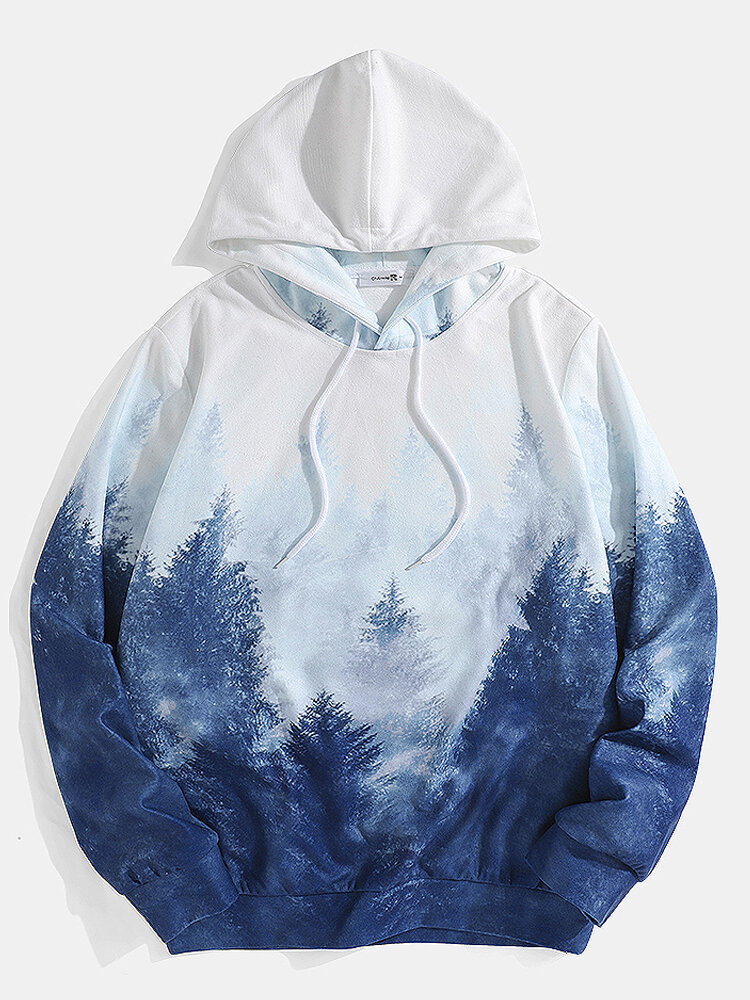 Mens Forest Landscape Print Long Sleeve Kangaroo Pocket Hoodies – M Green