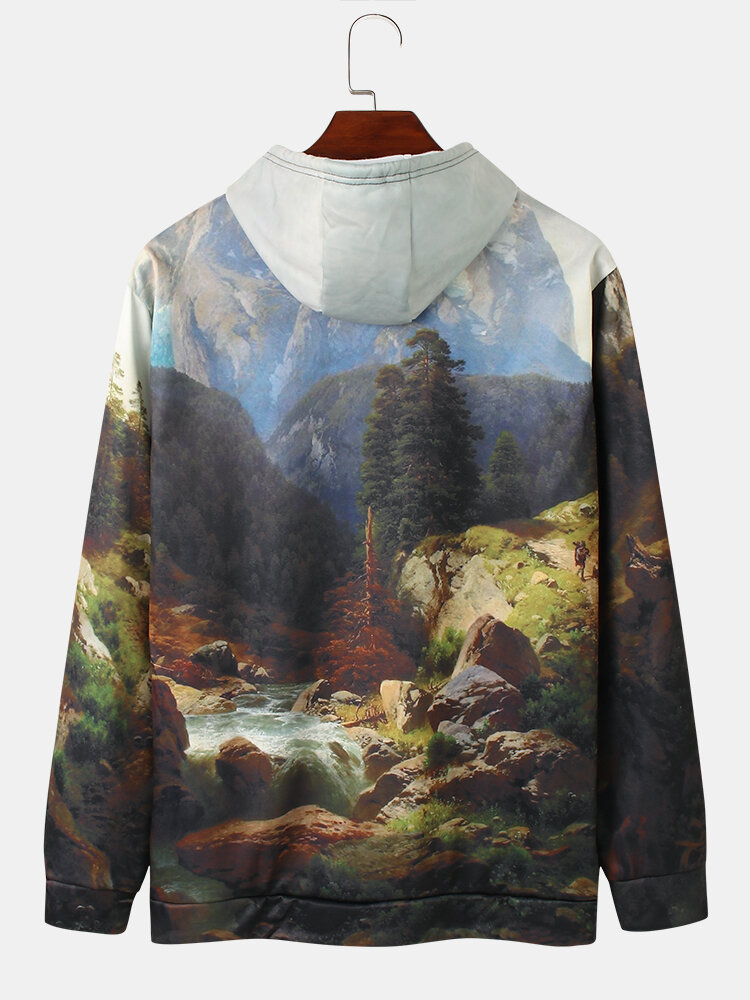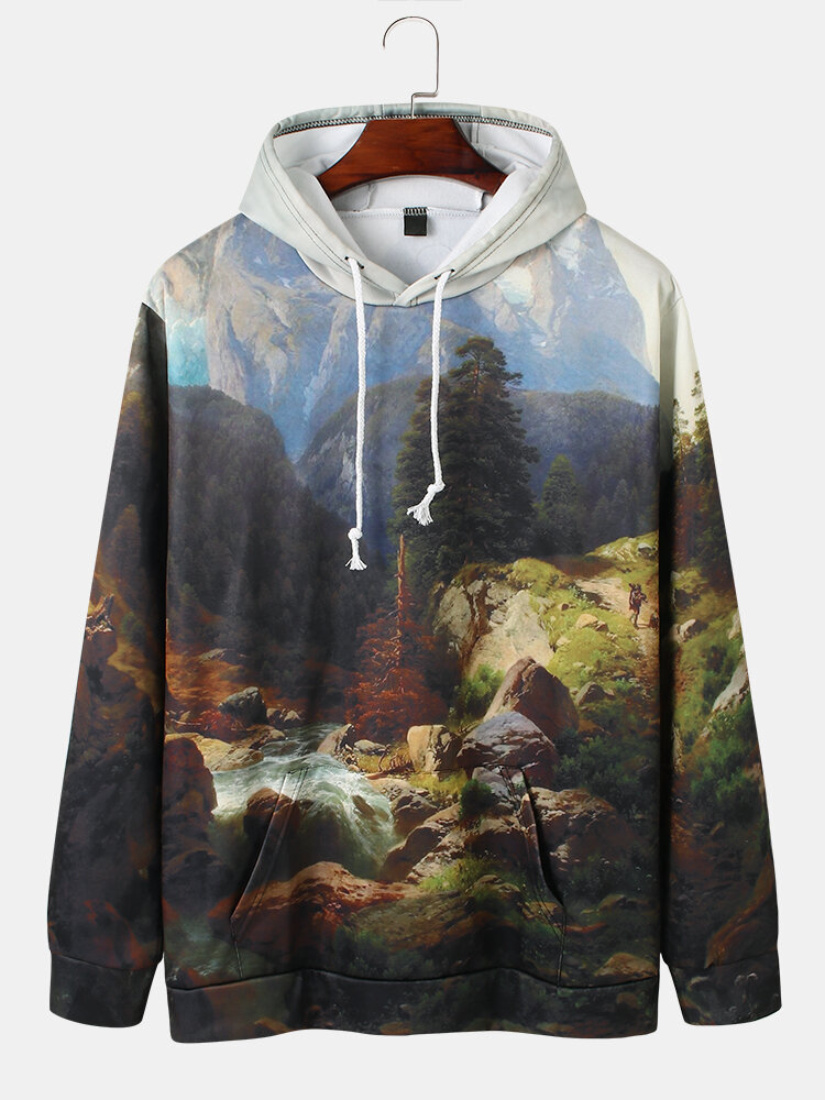 Mens Forest Landscape Print Warm Drawstring Hoodies With Pocket – Multicolor M