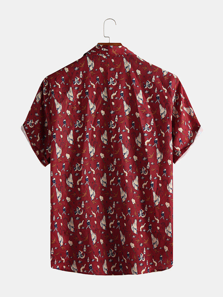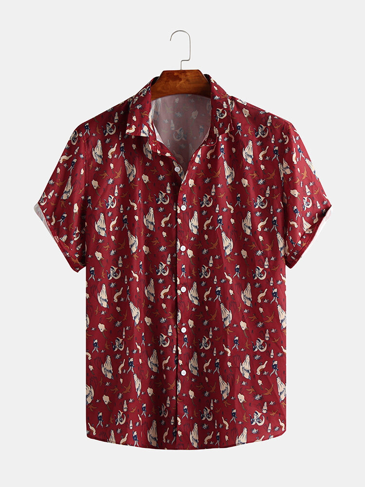 Mens Funny Animal Printed Short Sleeve Casual Shirts – L Red