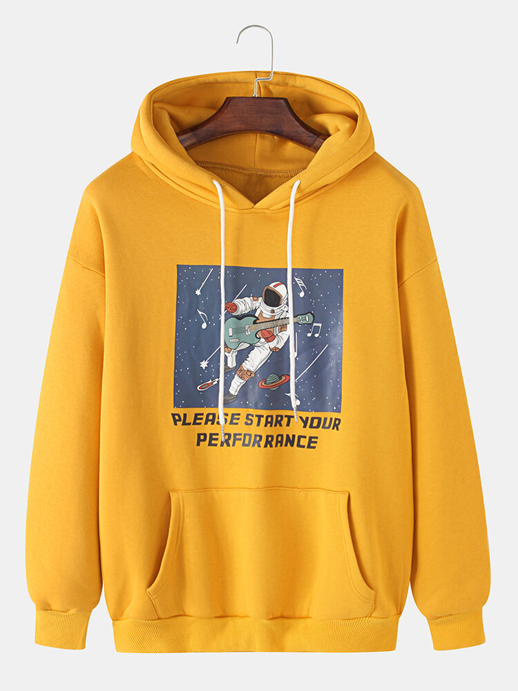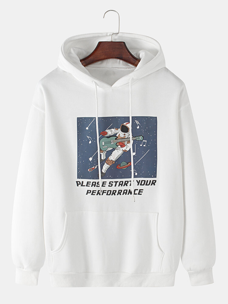 Mens Funny Astronaut & Letter Print Kangaroo Pocket Drop Shoulder Long Sleeve Cotton Hoodies – Grey M