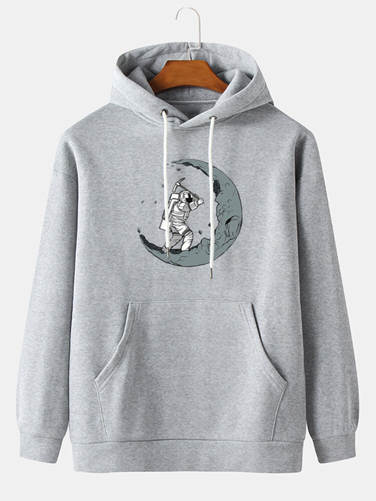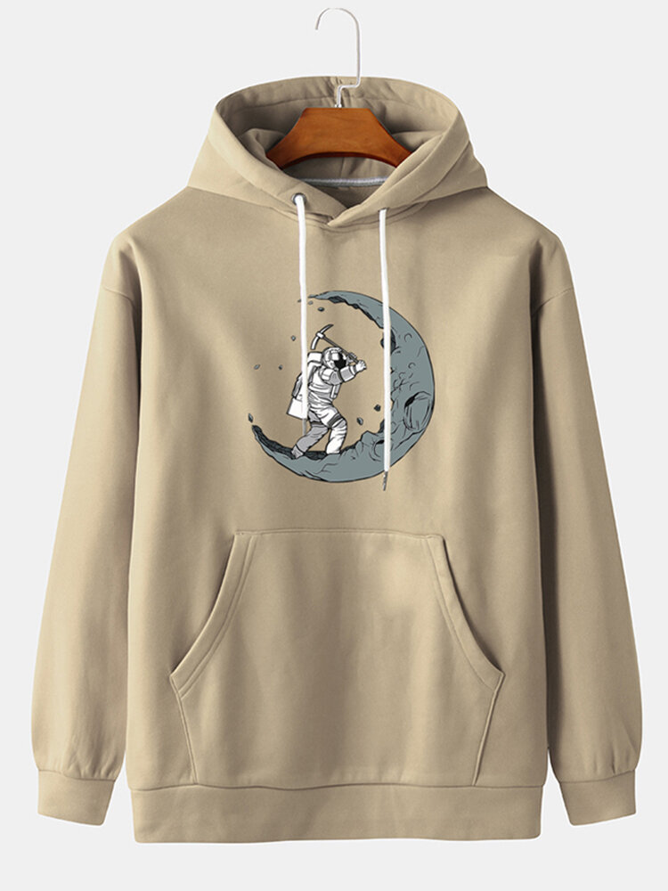 Mens Funny Astronaut Print Drop Shoulder Drawstring Hoodies – Khaki S