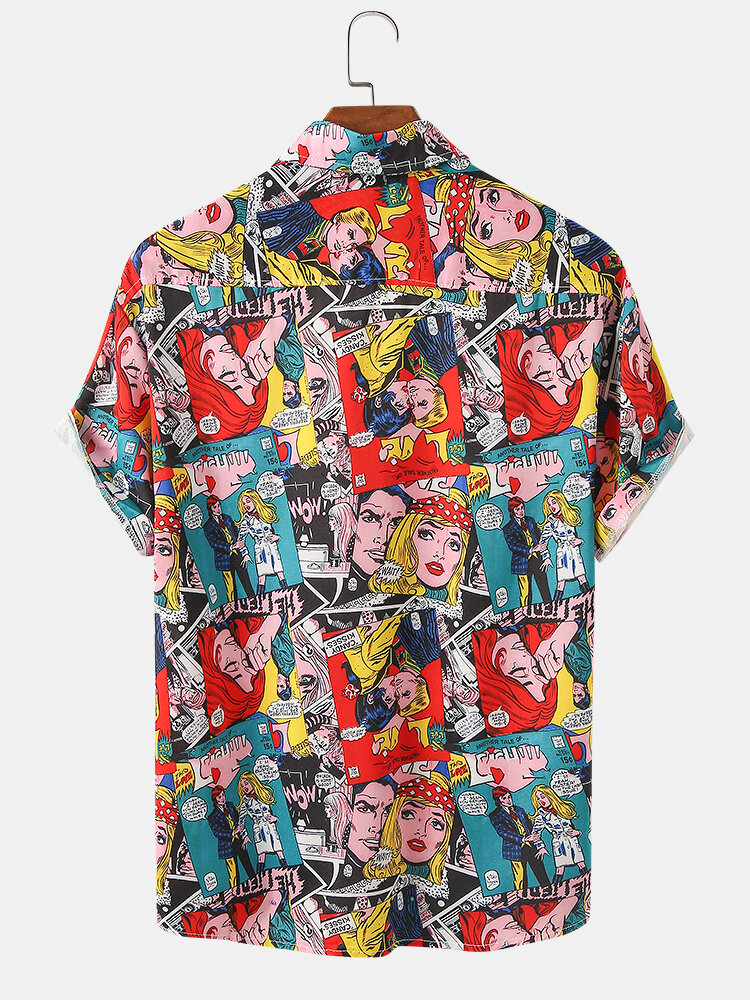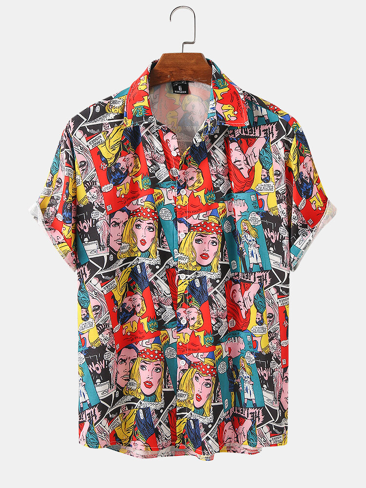 Mens Funny Comic Cartoon Print Lapel Collar Casual Short Sleeve Shirts – Red M
