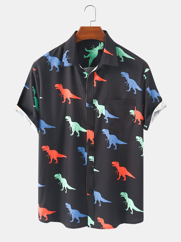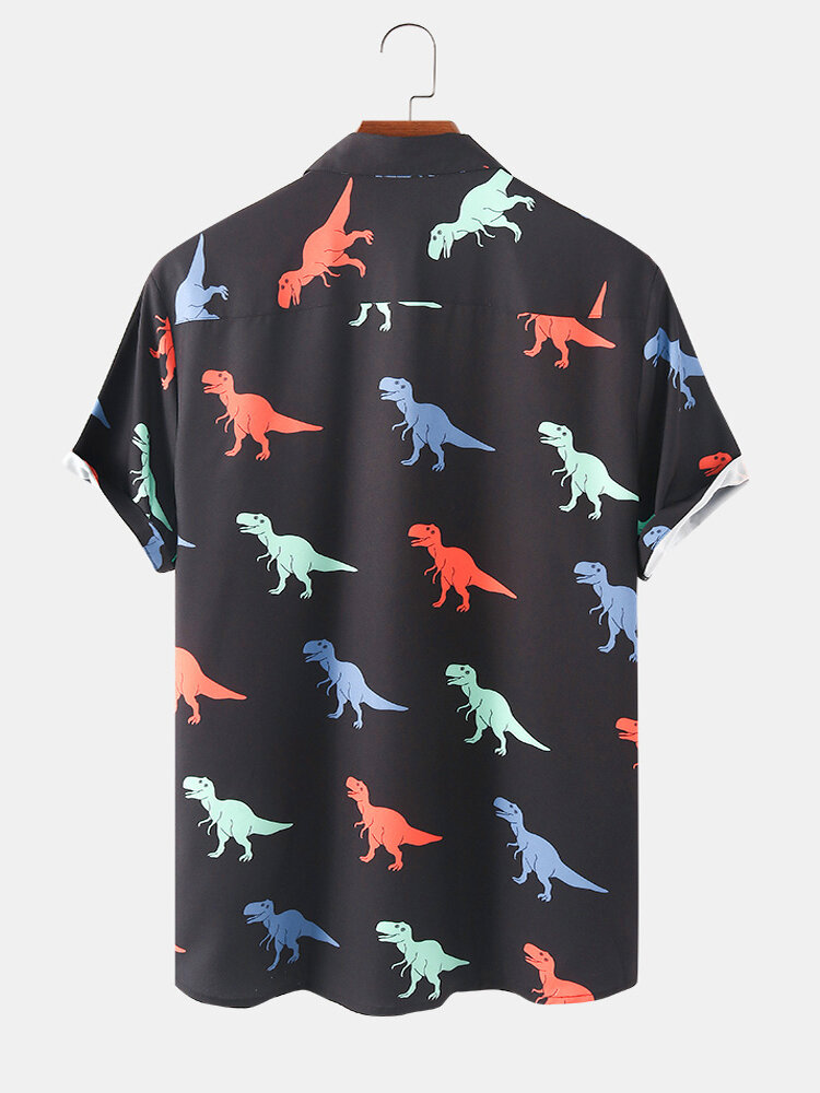 Mens Funny Dinasour Cartoon Short Sleeve Casual Shirts – Black S