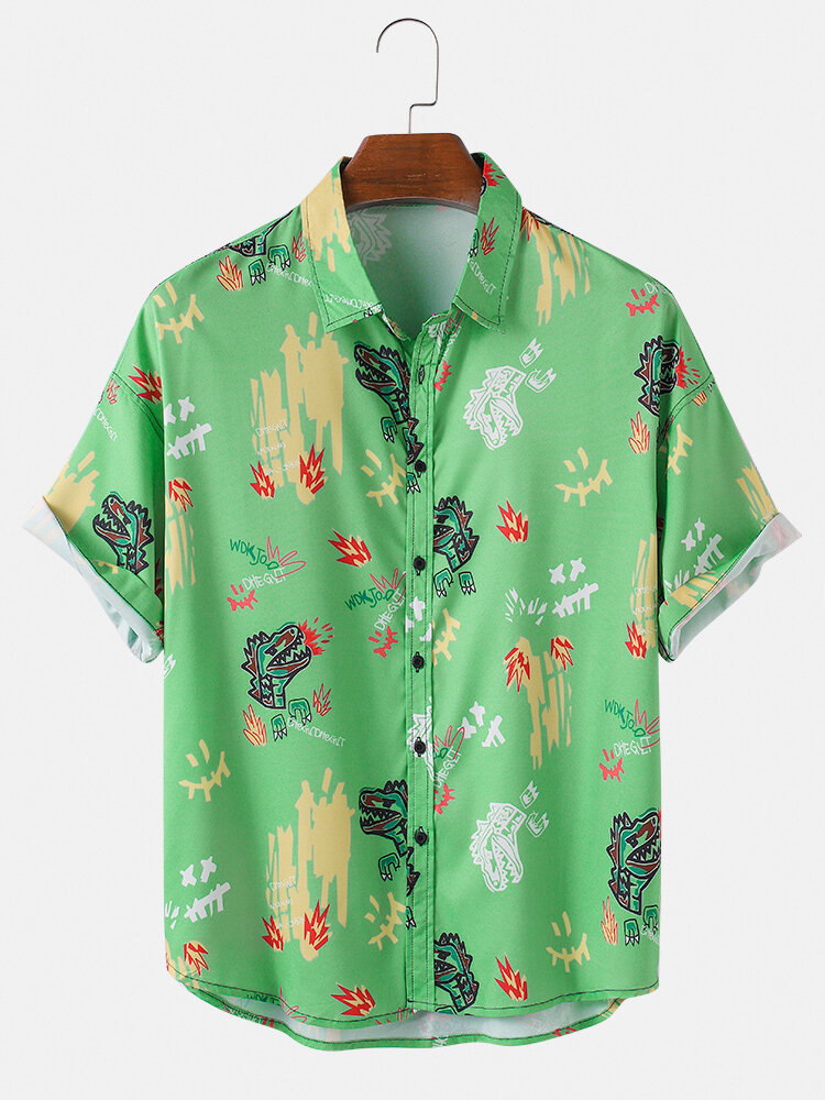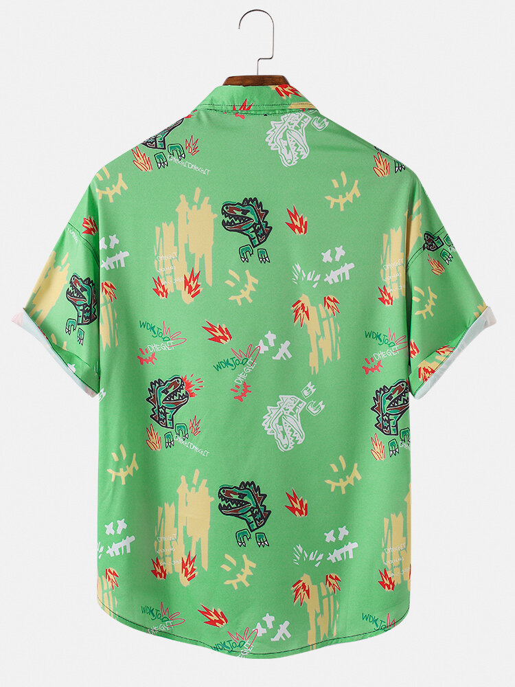 Mens Funny Dinosaur Cartoon Print Breathable Short Sleeve Casual Shirts – Black XL