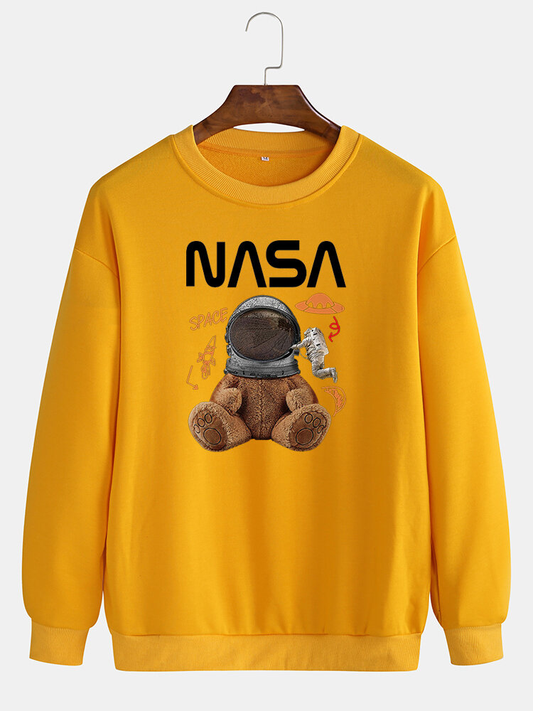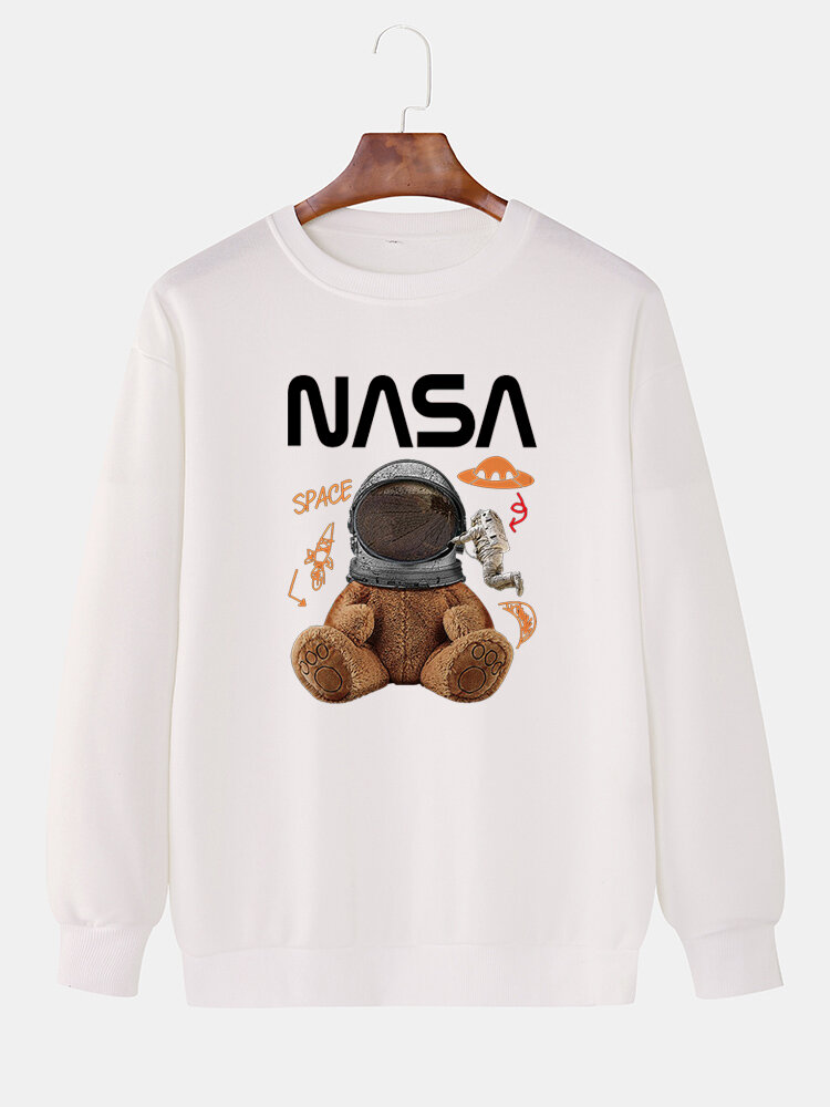 Mens Funny Doll Bear & Astronaut Print Pullover Drop Shoulder Sweatshirts – White S