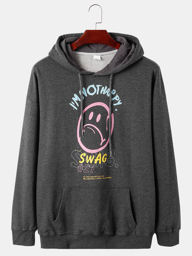 Mens Funny Emojis Chest Print Plain Loose Fit Drawstring Hoodies With Kangaroo Pocket – Black M