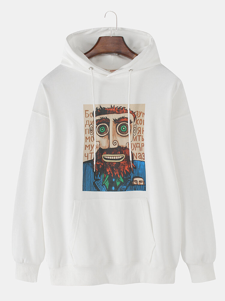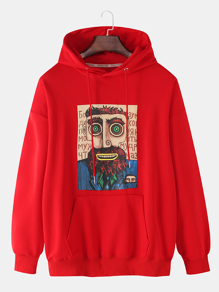 Mens Funny Figure Print Long Sleeve Drop Shoulder Kangaroo Pocket Drawstring Hoodies – Black L