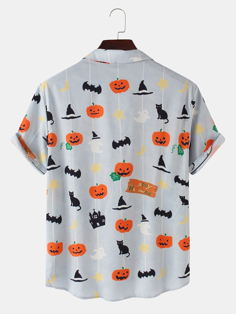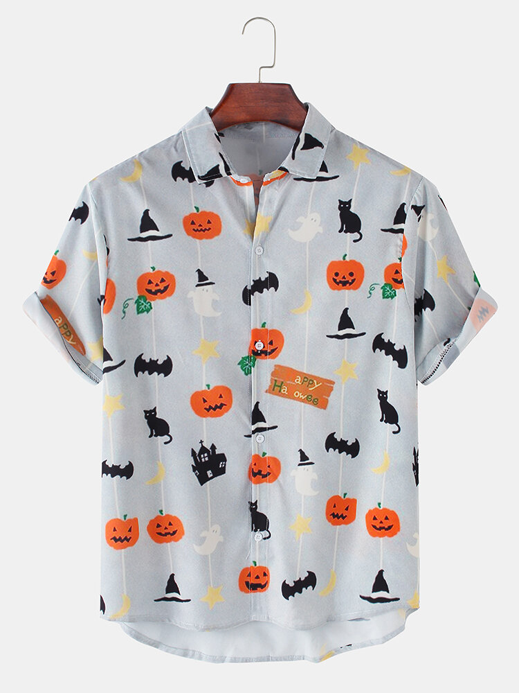 Mens Funny Pumpkin Cat Printed High Low Hem Short Sleeve Shirts – Grey M