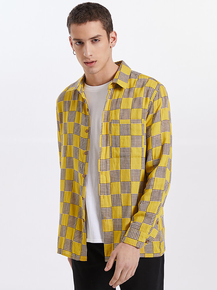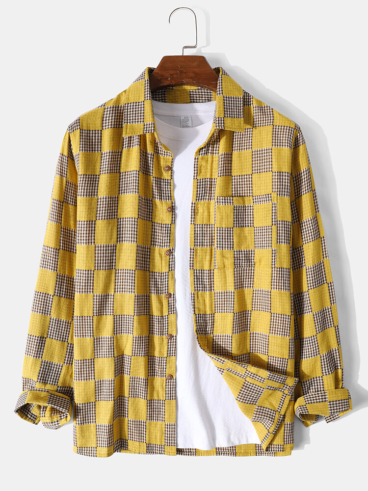 Mens Gingham Check Button Up 100% Cotton Long Sleeve Shirts – Yellow S